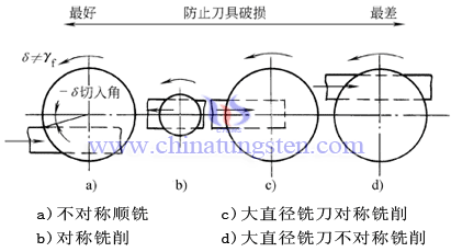 (3)合理选择工件与铣刀之间的相对位置:合理地选择面铣刀安装位置对减少面铣刀磨损起着重要作用。